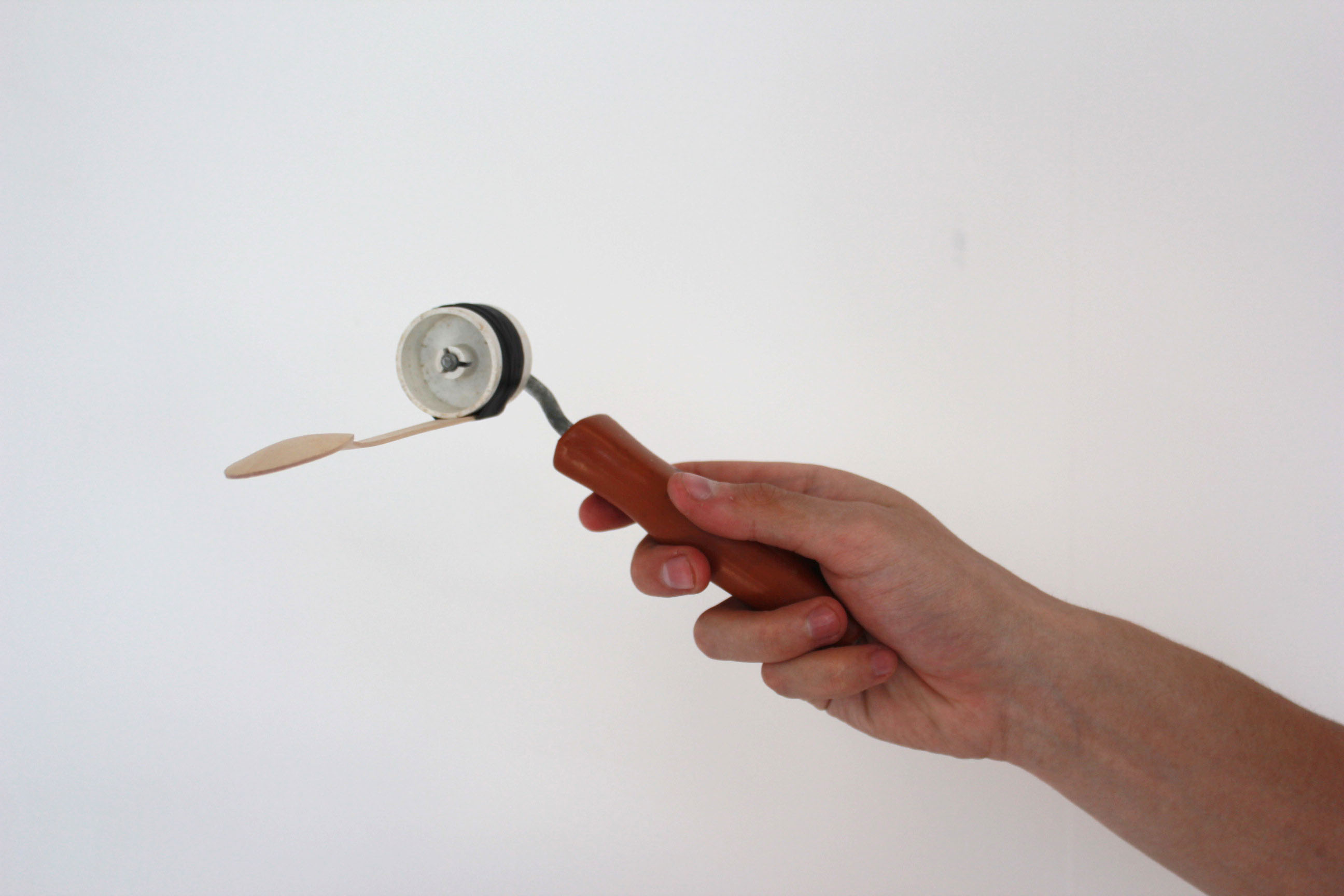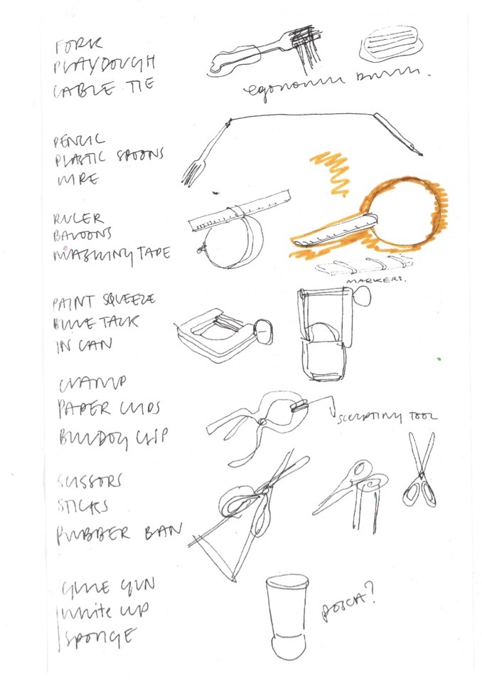 An exercise I discovered of taking random objects from around my house to create new tools with made up functions. This allows me to stop thinking about what already exists and enter a new world of stupid objects that don’t work very well.